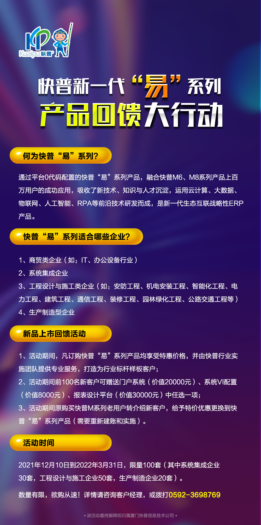 為了讓更多客戶搶先體驗(yàn)快普“易”系列產(chǎn)品,現(xiàn)推出“限量優(yōu)惠回饋大行動”。希望借助本次活動幫助更多企業(yè)在新財年實(shí)現(xiàn)管理升級、業(yè)務(wù)轉(zhuǎn)型;在別人觀望等待時,變“危機(jī)”為機(jī)會,在應(yīng)對競爭格局中尋求突破,取得又好又快的發(fā)展。