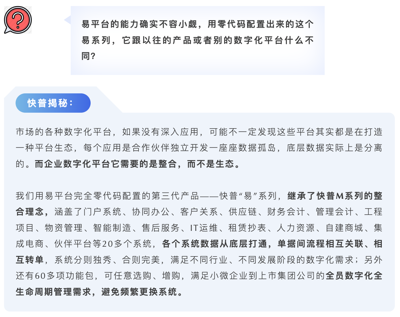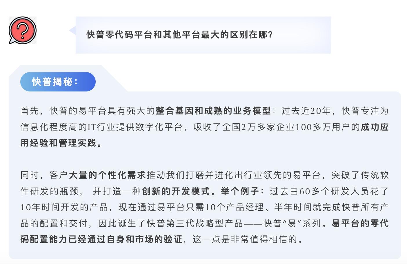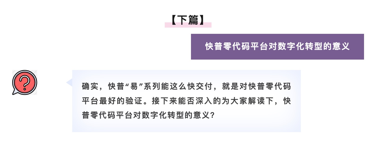 是的,我們可以很自信地說“快普零代碼平臺讓數(shù)字化轉(zhuǎn)型變得簡單、可行”。這個是面對數(shù)字化轉(zhuǎn)型的所有角色而言的,包括我們自身軟件研發(fā)、實施交付,以及合作伙伴、用戶等,易平臺在效率、成本、技術(shù)門檻和可擴展性等方面來說都有著顛覆性的突破,是非常有意義和必要的基礎(chǔ)設(shè)施。總結(jié)說有下面幾點: