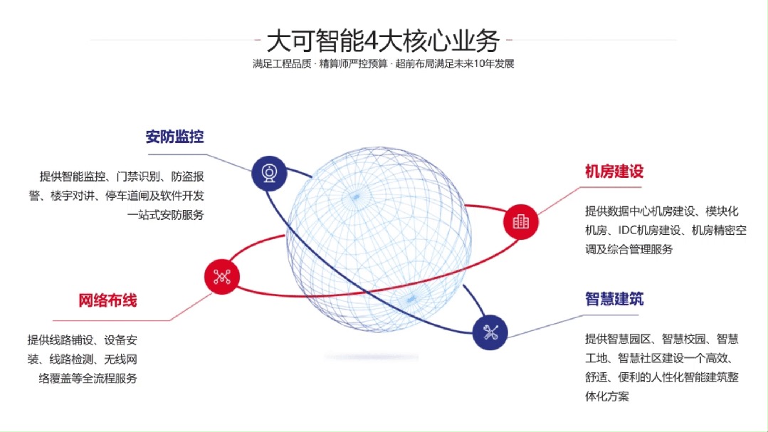 江蘇大可智能工程有限公司(以下簡稱“江蘇大可”)成立于 2010 年,是一家領(lǐng)先的弱電智能化系統(tǒng)綜合方案提供商,專注智慧建筑整體解決方案設計與施工,以及大型企業(yè)弱電系統(tǒng)集成,包括安全防范系統(tǒng)、網(wǎng)絡綜合布線系統(tǒng)、核心機房工程、多媒體廣播系統(tǒng)、智能樓宇控制系統(tǒng)等,同時圍繞集成項目開展銷售和運維服務。